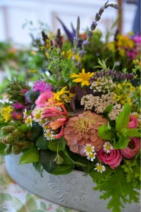 ラベンダー、ローズマリー、ミント、ベルガモット、ダイヤーズカモミール、ハニーサックル他など12種類ものハーブをふんだんに使った、香り溢れるアレンジメントです。