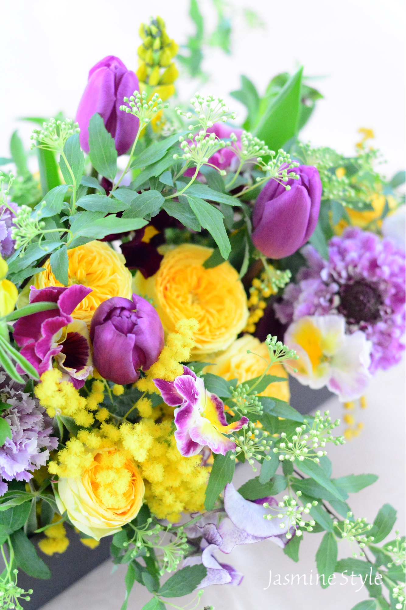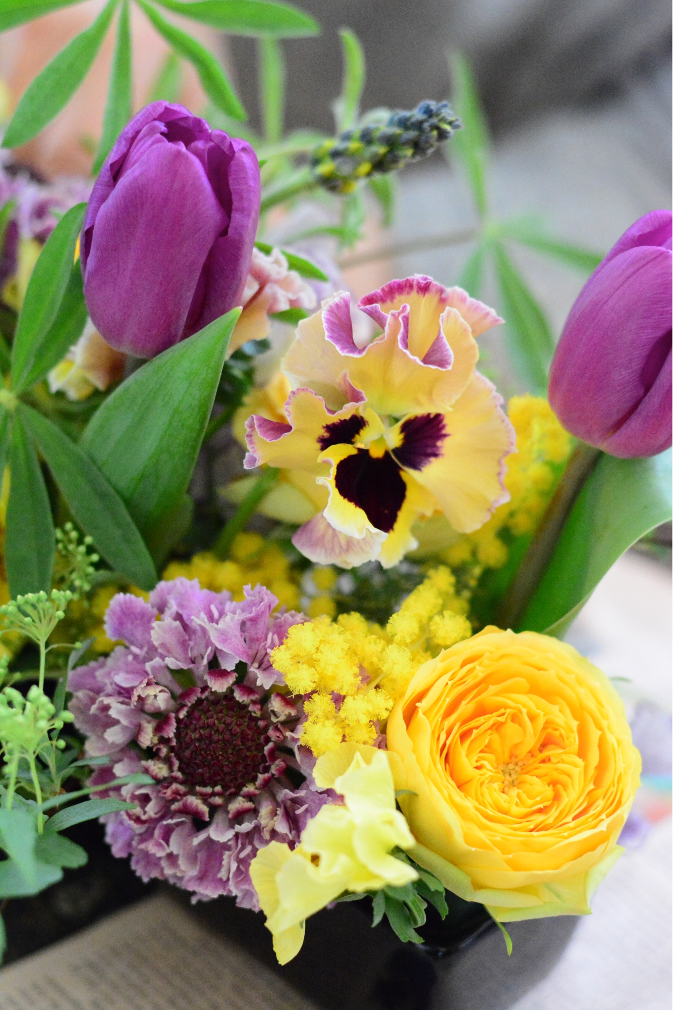 今回は、ミモザ、チューリップ、スイトピーなど春らしいお花ですが、パープルとイエローで少しシックで個性的な色合いをご用意いたしました。パンジーが可憐で可愛いです。普通のお花屋さんではあまり売