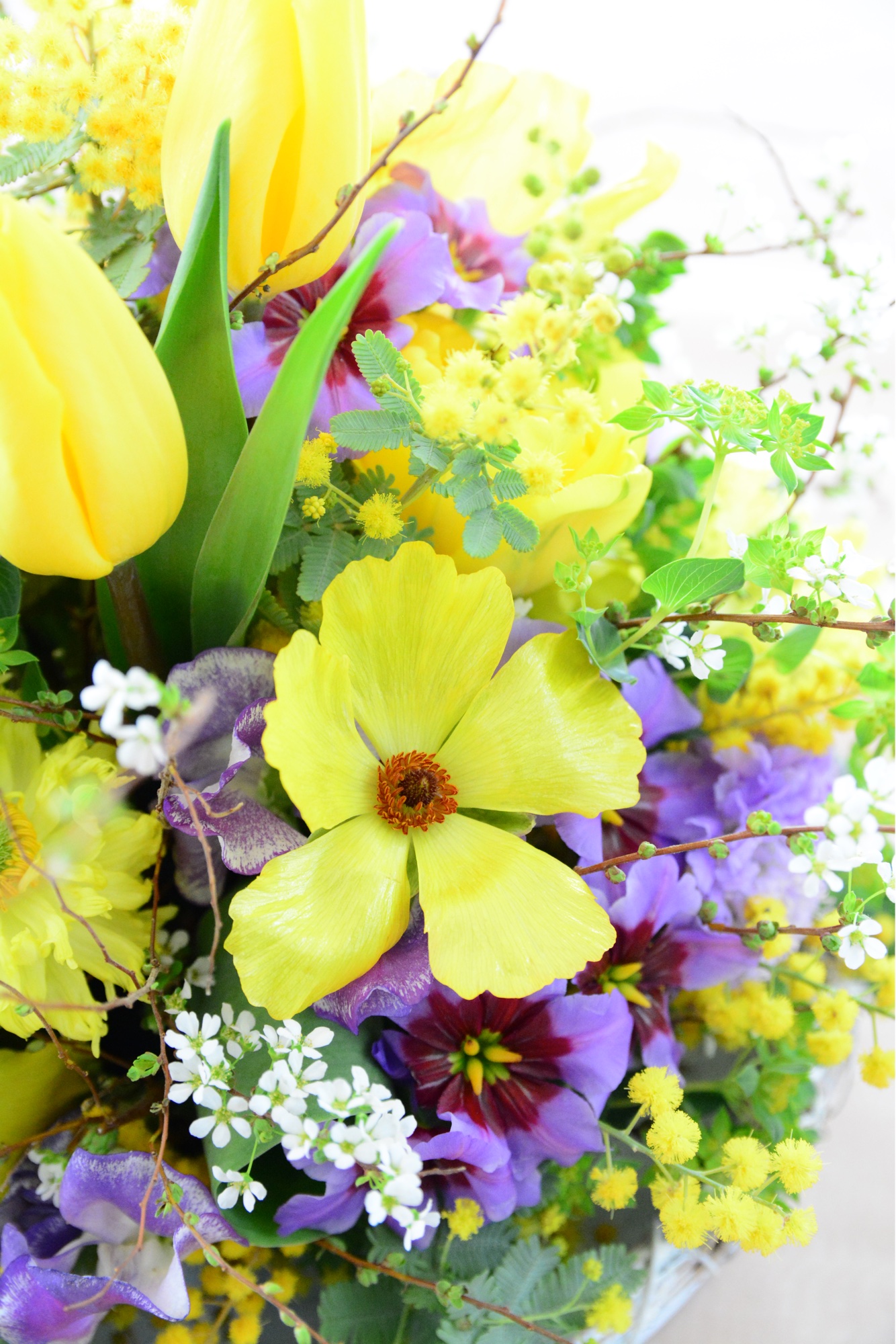 チューリップ、ラナンキュラス、スイトピー、スカビオサ、リューココリネ、ミモザ、ブプレリューム、ユキヤナギ、、たくさんの種類のお花をご用意いたしました。お部屋がパッと明るくなるような色合い。イエローは元気が出るカラーですね。