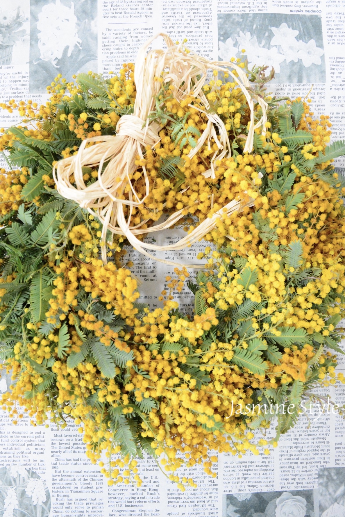 生徒さまからお庭のミモザをいただいたので、リースを作りました。