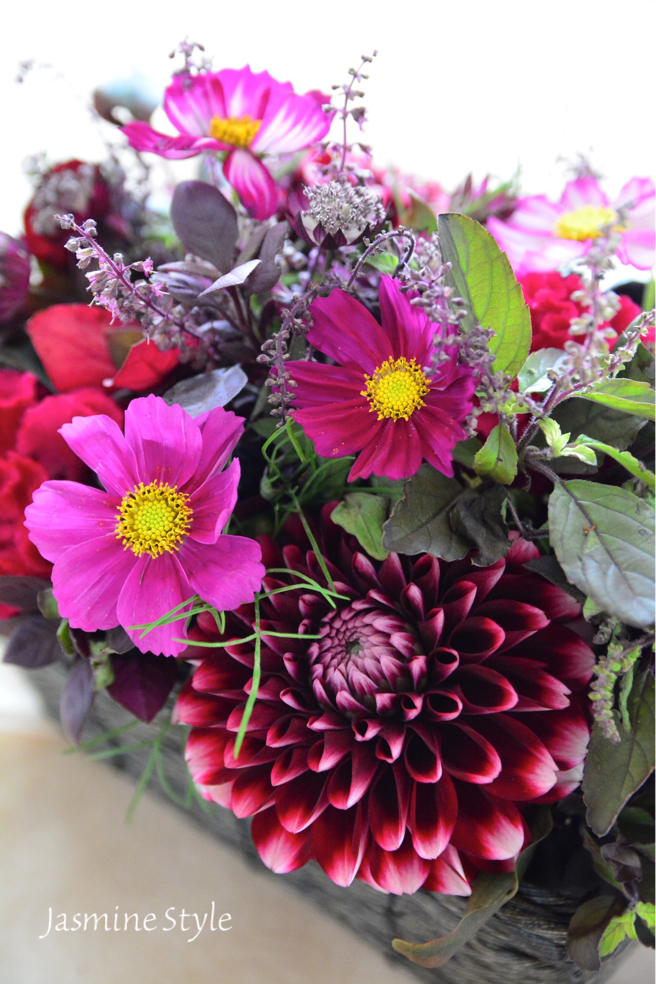 ワインレッドのシックな色合いの花材を選びました。大輪のダリアがゴージャスです。ケイトウ、コスモスなど秋らしいお花にコニカルのブラックの実がアクセントになっています。それぞれお手持ちのバスケットをご持参いただくので、バスケットによって少し違った印象になるのも楽しいです。