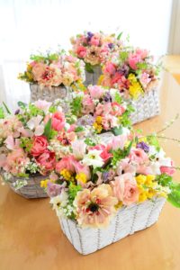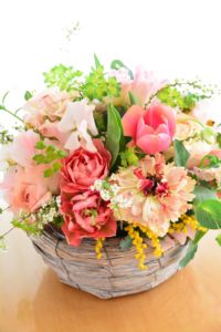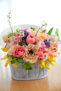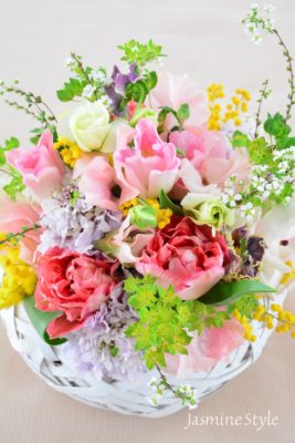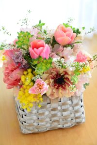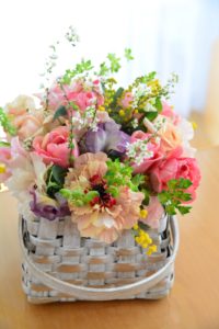 ご自分で花材、花器、リボンなどをお選びいただくレッスンです。ご自宅、ギフト用など、ご用途に合わせて、制作いただけるいつもご好評のレッスンです。母の日のギフトにもお使いいただけます。